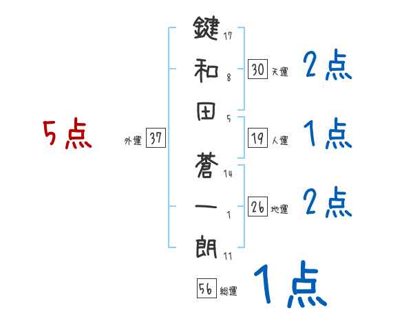 総運![]() | 鍵和田蒼一朗さんの総運は56画の1つ星!消極的で無気力になりがち。誠実な気持ちが必要でしょう。 あなたの人生を表す1番重要な運勢です。生涯を通じて影響する総合運となり、主に50歳以降の晩年期に影響を及ぼします。 |