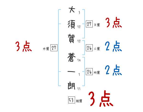総運![]() | 大須賀蒼一朗さんの総運は53画の3つ星!やや見栄っ張りで虚栄心がある。散財に注意。 あなたの人生を表す1番重要な運勢です。生涯を通じて影響する総合運となり、主に50歳以降の晩年期に影響を及ぼします。 |