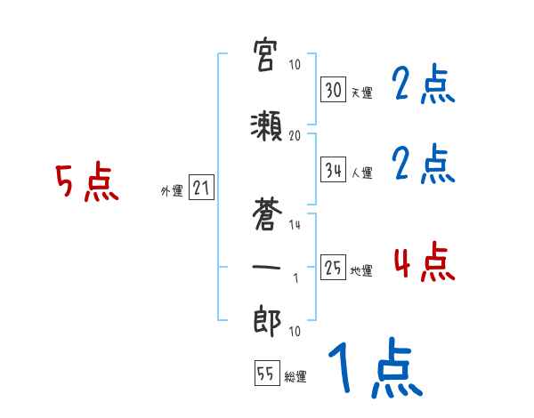 外運![]() | 宮瀬蒼一郎さんの外運は21画の5つ星!統率力がある。独立し成功する。名誉を手に入れる。 生活面を象徴する運勢です。外部から受ける影響力を表し、結婚運、家庭運や職場、環境への順応性を表します。 |