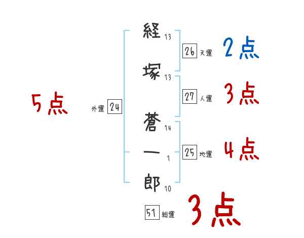 外運![]() | 経塚蒼一郎さんの外運は24画の5つ星!家庭運が良く順調な人生。金運にも恵まれる。 生活面を象徴する運勢です。外部から受ける影響力を表し、結婚運、家庭運や職場、環境への順応性を表します。 |
