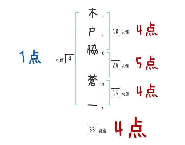 天運![]() | 木戸脇蒼一さんの天運は18画の4つ星!情熱的で剛気。忍耐力があり信頼される。 家系が持つ宿命的な運勢を表します。祖先から受け継いだ苗字ですので自分の力が及びません。家柄を象徴します。 |