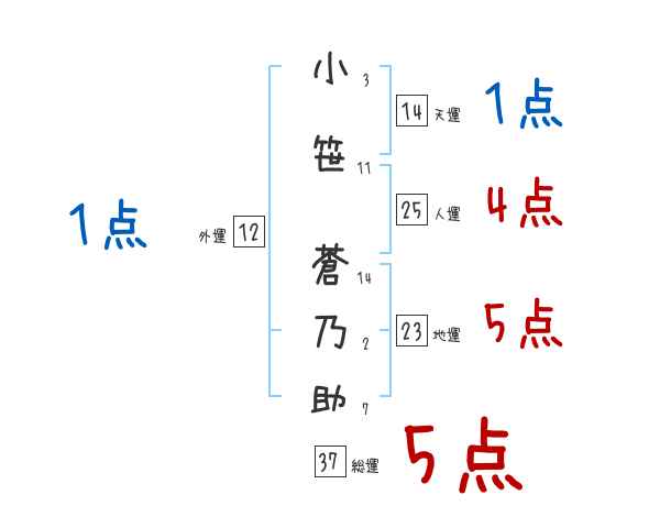 総運![]() | 小笹蒼乃助さんの総運は37画の5つ星!努力家で順応性に優れる。現実的な考え方ができ忠実に物事をこなす。 あなたの人生を表す1番重要な運勢です。生涯を通じて影響する総合運となり、主に50歳以降の晩年期に影響を及ぼします。 |