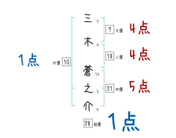 総運![]() | 三木蒼之介さんの総運は28画の1つ星!家庭環境に注意。スポーツで活躍できる能力があるかも。 あなたの人生を表す1番重要な運勢です。生涯を通じて影響する総合運となり、主に50歳以降の晩年期に影響を及ぼします。 |