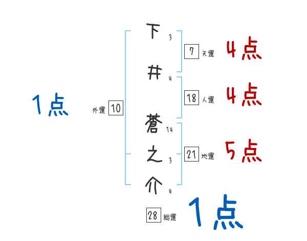 総運![]() | 下井蒼之介さんの総運は28画の1つ星!家庭環境に注意。スポーツで活躍できる能力があるかも。 あなたの人生を表す1番重要な運勢です。生涯を通じて影響する総合運となり、主に50歳以降の晩年期に影響を及ぼします。 |