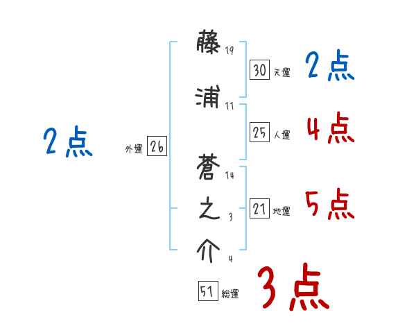 外運![]() | 藤浦蒼之介さんの外運は26画の2つ星!波瀾万丈かも。信頼できる人を大事にしましょう。 生活面を象徴する運勢です。外部から受ける影響力を表し、結婚運、家庭運や職場、環境への順応性を表します。 |