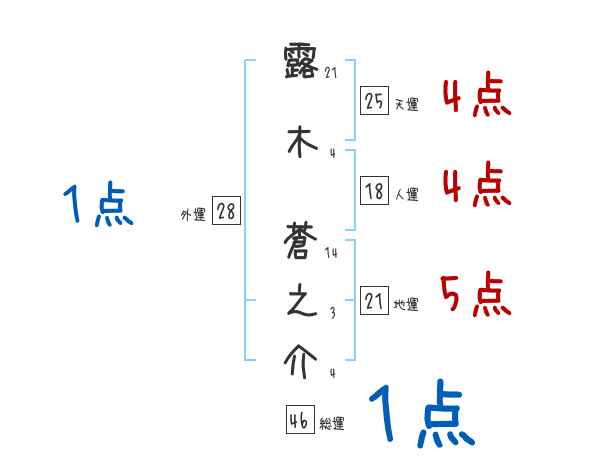 | 外運  | 露木蒼之介さんの外運は28画の1つ星!家庭環境に注意。スポーツで活躍できる能力があるかも。生活面を象徴する運勢です。外部から受ける影響力を表し、結婚運、家庭運や職場、環境への順応性を表します。 |
