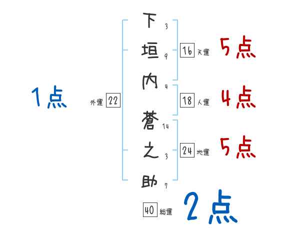 天運![]() | 下垣内蒼之助さんの天運は16画の5つ星!人望が厚く大きく発展する。逆転成功が見える。 家系が持つ宿命的な運勢を表します。祖先から受け継いだ苗字ですので自分の力が及びません。家柄を象徴します。 |