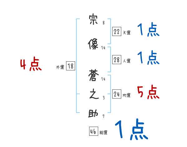 総運![]() | 宗像蒼之助さんの総運は46画の1つ星!迷走することが多く苦労するかも。目先のことにとらわれないように。 あなたの人生を表す1番重要な運勢です。生涯を通じて影響する総合運となり、主に50歳以降の晩年期に影響を及ぼします。 |