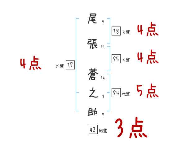 外運![]() | 尾張蒼之助さんの外運は17画の4つ星!積極的な行動力。地位を気づき財産を手に入れる。純粋な心と直感力。 生活面を象徴する運勢です。外部から受ける影響力を表し、結婚運、家庭運や職場、環境への順応性を表します。 |