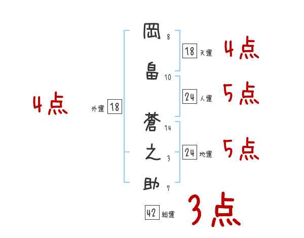 天運![]() | 岡畠蒼之助さんの天運は18画の4つ星!情熱的で剛気。忍耐力があり信頼される。 家系が持つ宿命的な運勢を表します。祖先から受け継いだ苗字ですので自分の力が及びません。家柄を象徴します。 |