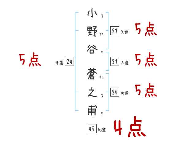 天運![]() | 小野谷蒼之甫さんの天運は21画の5つ星!統率力がある。独立し成功する。名誉を手に入れる。 家系が持つ宿命的な運勢を表します。祖先から受け継いだ苗字ですので自分の力が及びません。家柄を象徴します。 |