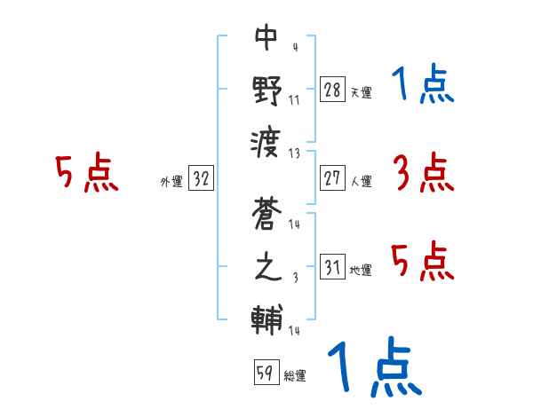 天運![]() | 中野渡蒼之輔さんの天運は28画の1つ星!家庭環境に注意。スポーツで活躍できる能力があるかも。 家系が持つ宿命的な運勢を表します。祖先から受け継いだ苗字ですので自分の力が及びません。家柄を象徴します。 |