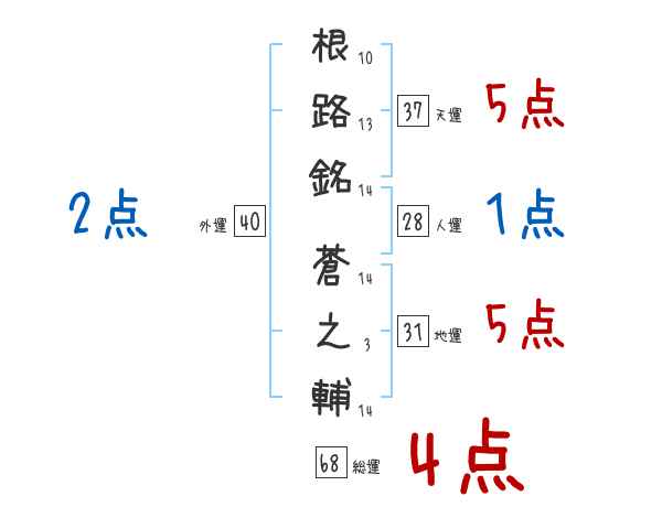 地運![]() | 根路銘蒼之輔さんの地運は31画の5つ星!社交性があり判断力に優れる。順風満帆な人生で円満な生活。 個性を表す基礎的な運勢です。性格形成や対人関係、行動力など家庭環境に影響されます。主に誕生してから20歳くらいまでの若年期の運勢を表します。 |