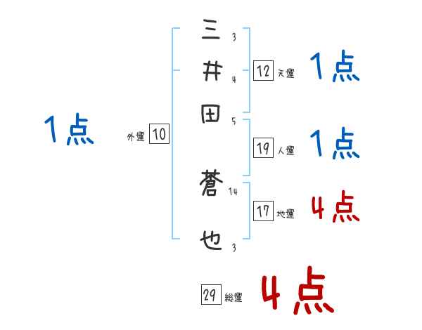 総運![]() | 三井田蒼也さんの総運は29画の4つ星!完全主義で才能がある。厳格な心の持ち主。 あなたの人生を表す1番重要な運勢です。生涯を通じて影響する総合運となり、主に50歳以降の晩年期に影響を及ぼします。 |