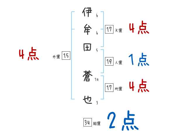 総運![]() | 伊牟田蒼也さんの総運は34画の2つ星!独創性に優れるが、自尊心が強く災難に注意しましょう。 あなたの人生を表す1番重要な運勢です。生涯を通じて影響する総合運となり、主に50歳以降の晩年期に影響を及ぼします。 |