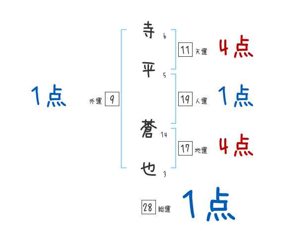 天運![]() | 寺平蒼也さんの天運は11画の4つ星!着実に富や地位を得る幸運な人生。 家系が持つ宿命的な運勢を表します。祖先から受け継いだ苗字ですので自分の力が及びません。家柄を象徴します。 |