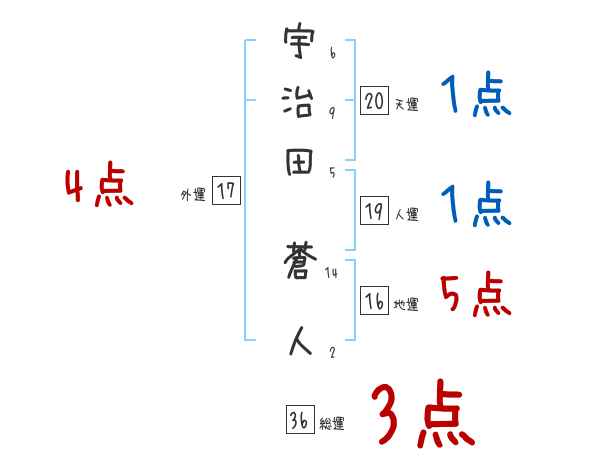 総運![]() | 宇治田蒼人さんの総運は36画の3つ星!先見性が豊かです。多少神経質で苦労することも。 あなたの人生を表す1番重要な運勢です。生涯を通じて影響する総合運となり、主に50歳以降の晩年期に影響を及ぼします。 |