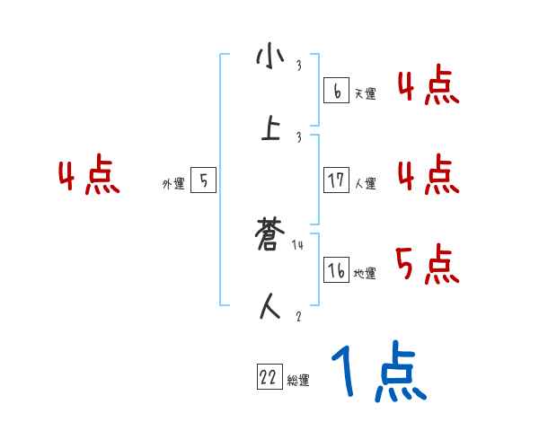 総運![]() | 小上蒼人さんの総運は22画の1つ星!努力することが苦手ないっぽう手先が器用。芸術性にも優れる。 あなたの人生を表す1番重要な運勢です。生涯を通じて影響する総合運となり、主に50歳以降の晩年期に影響を及ぼします。 |
