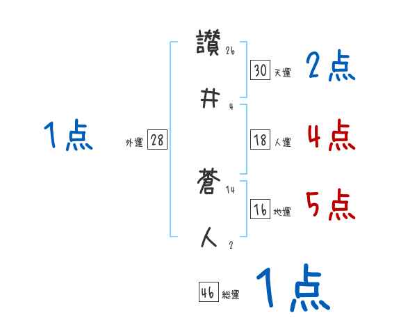 天運![]() | 讃井蒼人さんの天運は30画の2つ星!浮き沈みの激しさに注意しましょう。 家系が持つ宿命的な運勢を表します。祖先から受け継いだ苗字ですので自分の力が及びません。家柄を象徴します。 |