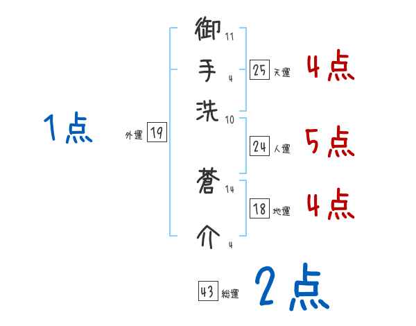 天運![]() | 御手洗蒼介さんの天運は25画の4つ星!個性があり才能があふれる。強運の持ち主で発展する。 家系が持つ宿命的な運勢を表します。祖先から受け継いだ苗字ですので自分の力が及びません。家柄を象徴します。 |