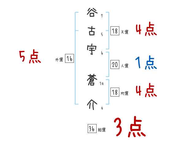 総運![]() | 谷古宇蒼介さんの総運は36画の3つ星!先見性が豊かです。多少神経質で苦労することも。 あなたの人生を表す1番重要な運勢です。生涯を通じて影響する総合運となり、主に50歳以降の晩年期に影響を及ぼします。 |