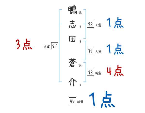 天運![]() | 鴨志田蒼介さんの天運は28画の1つ星!家庭環境に注意。スポーツで活躍できる能力があるかも。 家系が持つ宿命的な運勢を表します。祖先から受け継いだ苗字ですので自分の力が及びません。家柄を象徴します。 |