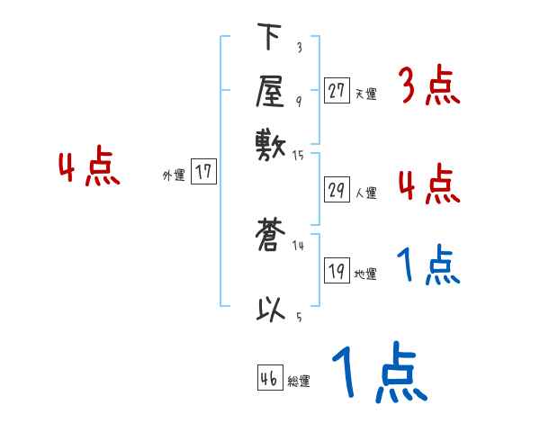 天運![]() | 下屋敷蒼以さんの天運は27画の3つ星!頭脳明晰だが強情で摩擦が多い傾向。孤立に注意。 家系が持つ宿命的な運勢を表します。祖先から受け継いだ苗字ですので自分の力が及びません。家柄を象徴します。 |