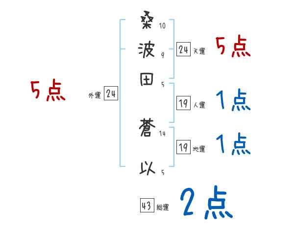 天運![]() | 桑波田蒼以さんの天運は24画の5つ星!家庭運が良く順調な人生。金運にも恵まれる。 家系が持つ宿命的な運勢を表します。祖先から受け継いだ苗字ですので自分の力が及びません。家柄を象徴します。 |