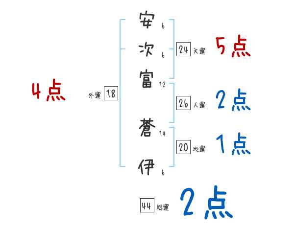 天運![]() | 安次富蒼伊さんの天運は24画の5つ星!家庭運が良く順調な人生。金運にも恵まれる。 家系が持つ宿命的な運勢を表します。祖先から受け継いだ苗字ですので自分の力が及びません。家柄を象徴します。 |