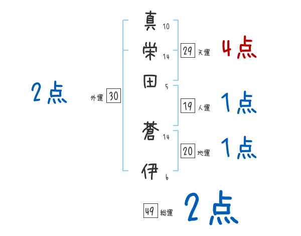 天運![]() | 真栄田蒼伊さんの天運は29画の4つ星!完全主義で才能がある。厳格な心の持ち主。 家系が持つ宿命的な運勢を表します。祖先から受け継いだ苗字ですので自分の力が及びません。家柄を象徴します。 |