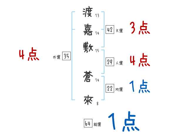 天運![]() | 渡嘉敷蒼來さんの天運は42画の3つ星!病気に注意。多芸であるが消極的でおとなしい。 家系が持つ宿命的な運勢を表します。祖先から受け継いだ苗字ですので自分の力が及びません。家柄を象徴します。 |