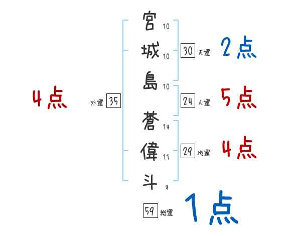 総運![]() | 宮城島蒼偉斗さんの総運は59画の1つ星!意志の弱さであきらめることが多いかも。粘り強さが必要。 あなたの人生を表す1番重要な運勢です。生涯を通じて影響する総合運となり、主に50歳以降の晩年期に影響を及ぼします。 |