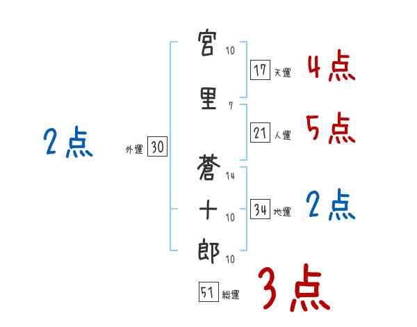 人運![]() | 宮里蒼十郎さんの人運は21画の5つ星!統率力がある。独立し成功する。名誉を手に入れる。 性格や才能などを表す2番目に重要な運勢です。人間関係や協調性、社会的な成功に影響します。主に20歳から50歳ぐらいまでの中年期の運勢を表します。 |
