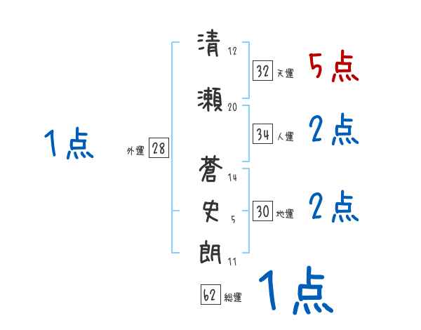 天運![]() | 清瀬蒼史朗さんの天運は32画の5つ星!柔軟性があり成功する。チャンスが多く金運が良い。 家系が持つ宿命的な運勢を表します。祖先から受け継いだ苗字ですので自分の力が及びません。家柄を象徴します。 |
