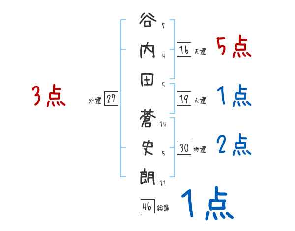 天運![]() | 谷内田蒼史朗さんの天運は16画の5つ星!人望が厚く大きく発展する。逆転成功が見える。 家系が持つ宿命的な運勢を表します。祖先から受け継いだ苗字ですので自分の力が及びません。家柄を象徴します。 |