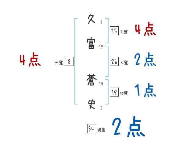 総運![]() | 久富蒼史さんの総運は34画の2つ星!独創性に優れるが、自尊心が強く災難に注意しましょう。 あなたの人生を表す1番重要な運勢です。生涯を通じて影響する総合運となり、主に50歳以降の晩年期に影響を及ぼします。 |