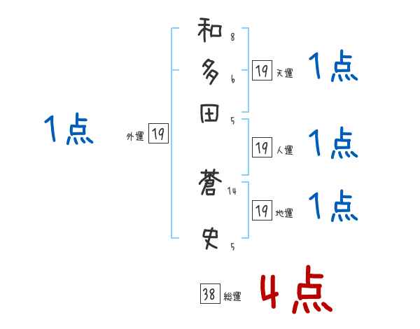 天運![]() | 和多田蒼史さんの天運は19画の1つ星!優れた才能を持ちますが、協調性が足りないことも。周りの人と協力する事を意識しましょう。 家系が持つ宿命的な運勢を表します。祖先から受け継いだ苗字ですので自分の力が及びません。家柄を象徴します。 |