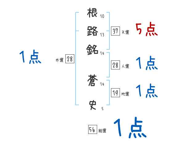 総運![]() | 根路銘蒼史さんの総運は56画の1つ星!消極的で無気力になりがち。誠実な気持ちが必要でしょう。 あなたの人生を表す1番重要な運勢です。生涯を通じて影響する総合運となり、主に50歳以降の晩年期に影響を及ぼします。 |