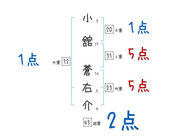 外運![]() | 小舘蒼右介さんの外運は12画の1つ星!簡単な失敗で諦めてしまいやすいかも。着実に行動すると良いでしょう。 生活面を象徴する運勢です。外部から受ける影響力を表し、結婚運、家庭運や職場、環境への順応性を表します。 |