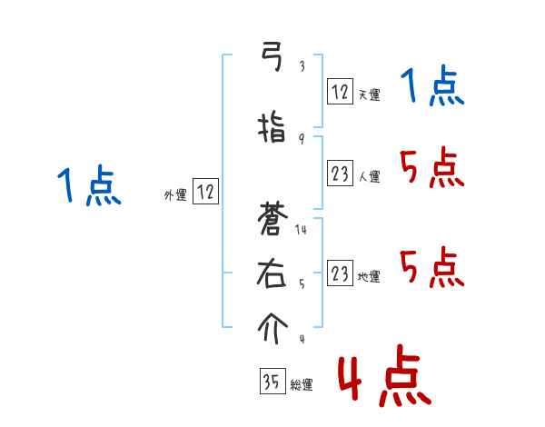 天運![]() | 弓指蒼右介さんの天運は12画の1つ星!簡単な失敗で諦めてしまいやすいかも。着実に行動すると良いでしょう。 家系が持つ宿命的な運勢を表します。祖先から受け継いだ苗字ですので自分の力が及びません。家柄を象徴します。 |