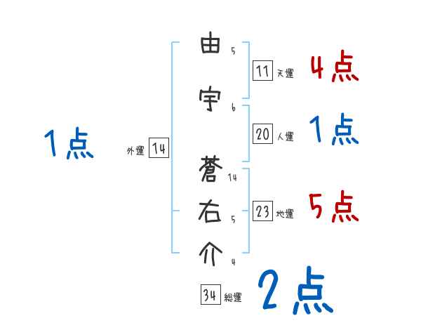 天運![]() | 由宇蒼右介さんの天運は11画の4つ星!着実に富や地位を得る幸運な人生。 家系が持つ宿命的な運勢を表します。祖先から受け継いだ苗字ですので自分の力が及びません。家柄を象徴します。 |