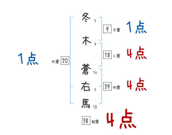 天運![]() | 冬木蒼右馬さんの天運は9画の1つ星!消極的で才能を発揮することが苦手なことも。周りの意見に耳を傾けましょう。 家系が持つ宿命的な運勢を表します。祖先から受け継いだ苗字ですので自分の力が及びません。家柄を象徴します。 |