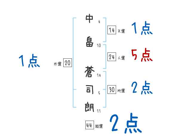 人運![]() | 中畠蒼司朗さんの人運は24画の5つ星!家庭運が良く順調な人生。金運にも恵まれる。 性格や才能などを表す2番目に重要な運勢です。人間関係や協調性、社会的な成功に影響します。主に20歳から50歳ぐらいまでの中年期の運勢を表します。 |