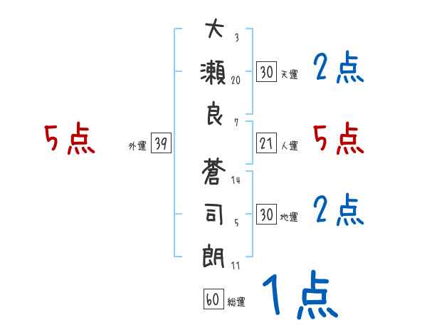 外運![]() | 大瀬良蒼司朗さんの外運は39画の5つ星!社交性に優れ人望が厚い。人の上に立ち成功する。 生活面を象徴する運勢です。外部から受ける影響力を表し、結婚運、家庭運や職場、環境への順応性を表します。 |