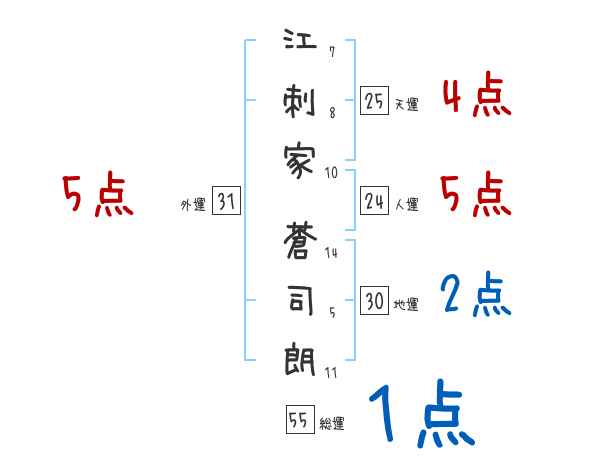 人運![]() | 江刺家蒼司朗さんの人運は24画の5つ星!家庭運が良く順調な人生。金運にも恵まれる。 性格や才能などを表す2番目に重要な運勢です。人間関係や協調性、社会的な成功に影響します。主に20歳から50歳ぐらいまでの中年期の運勢を表します。 |