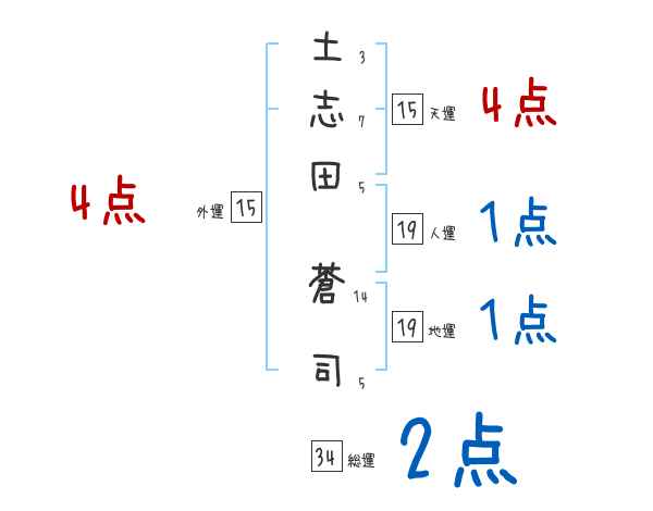 総運![]() | 土志田蒼司さんの総運は34画の2つ星!独創性に優れるが、自尊心が強く災難に注意しましょう。 あなたの人生を表す1番重要な運勢です。生涯を通じて影響する総合運となり、主に50歳以降の晩年期に影響を及ぼします。 |