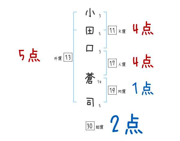 天運![]() | 小田口蒼司さんの天運は11画の4つ星!着実に富や地位を得る幸運な人生。 家系が持つ宿命的な運勢を表します。祖先から受け継いだ苗字ですので自分の力が及びません。家柄を象徴します。 |