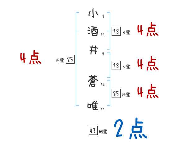 天運![]() | 小酒井蒼唯さんの天運は18画の4つ星!情熱的で剛気。忍耐力があり信頼される。 家系が持つ宿命的な運勢を表します。祖先から受け継いだ苗字ですので自分の力が及びません。家柄を象徴します。 |