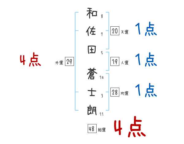外運![]() | 和佐田蒼士朗さんの外運は29画の4つ星!完全主義で才能がある。厳格な心の持ち主。 生活面を象徴する運勢です。外部から受ける影響力を表し、結婚運、家庭運や職場、環境への順応性を表します。 |