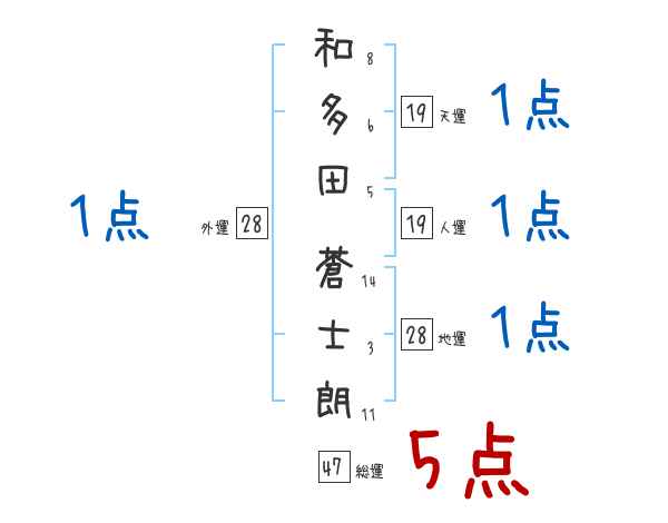 天運![]() | 和多田蒼士朗さんの天運は19画の1つ星!優れた才能を持ちますが、協調性が足りないことも。周りの人と協力する事を意識しましょう。 家系が持つ宿命的な運勢を表します。祖先から受け継いだ苗字ですので自分の力が及びません。家柄を象徴します。 |